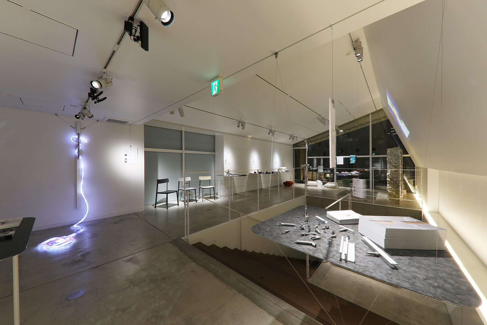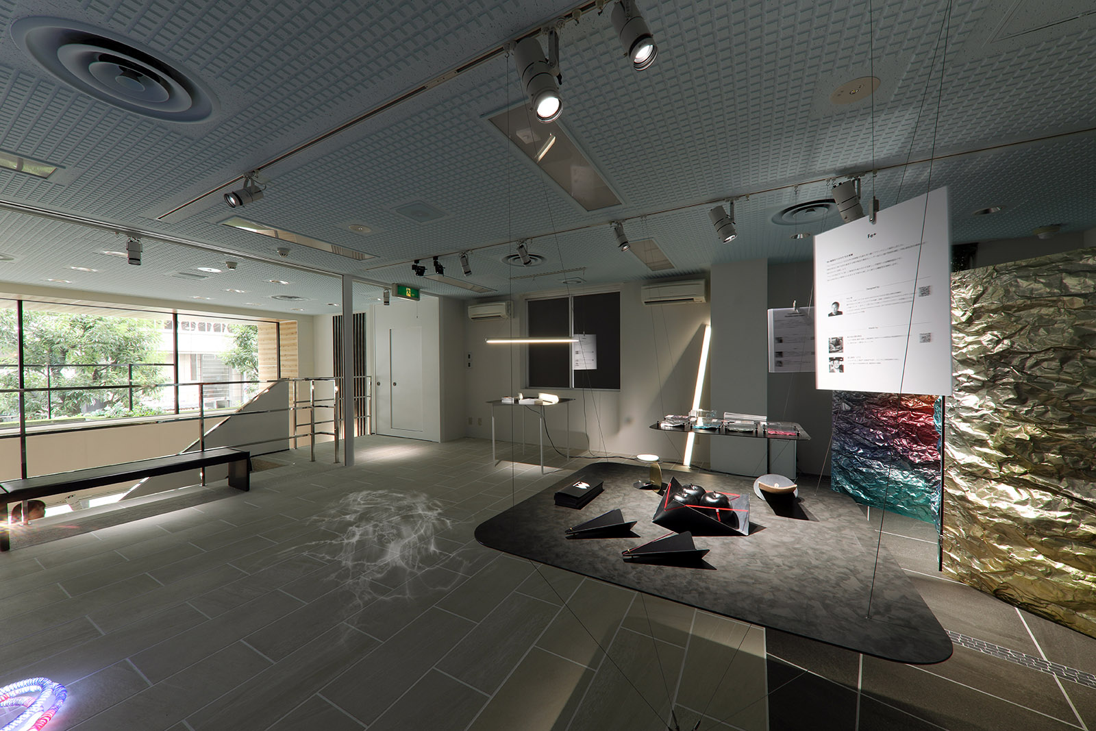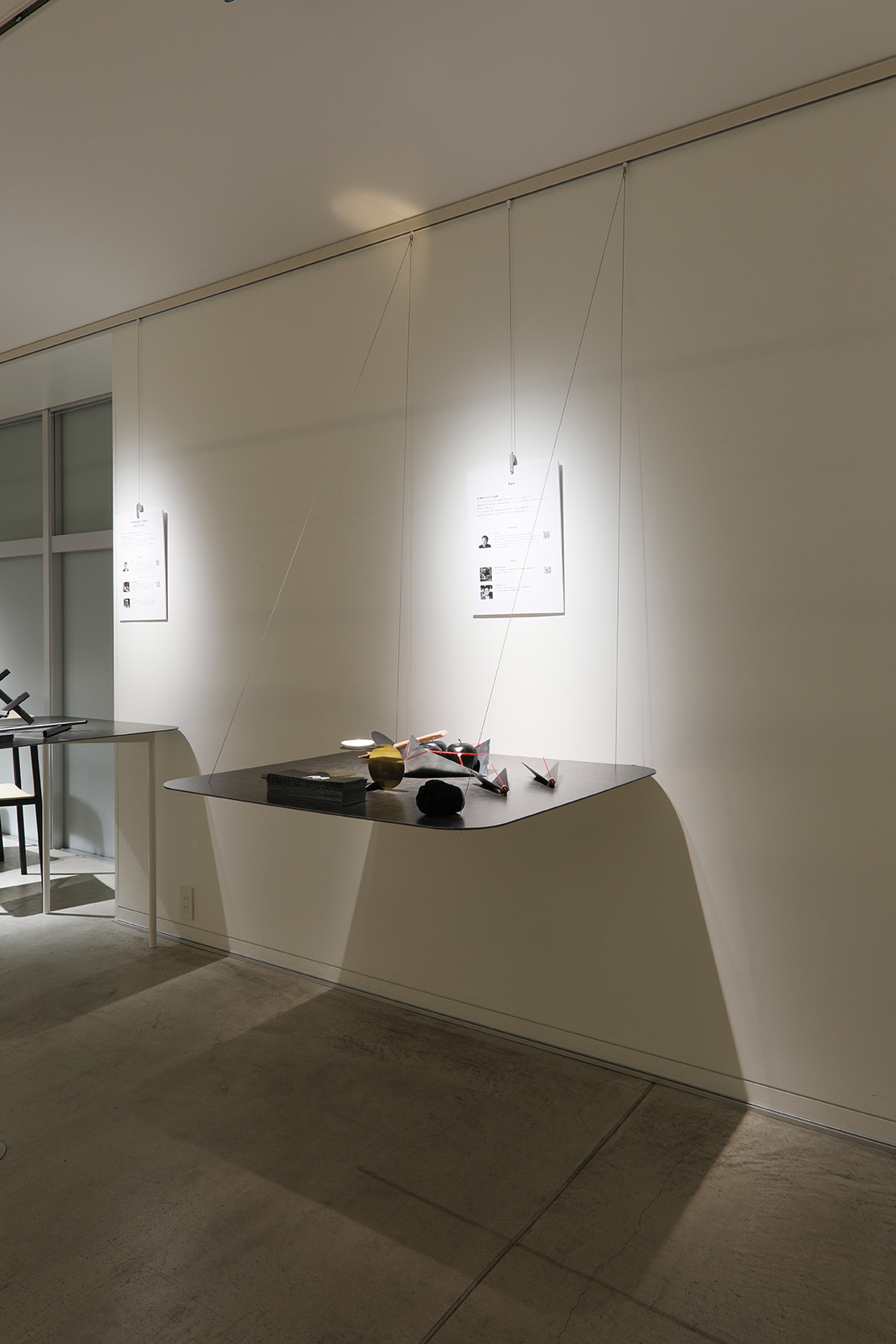 展示作品に自然と視線が集まるよう、展示台の存在感を極限まで抑えました。厚さ4mmのアルポリックを用いた天板に、荒川技研工業のワイヤーシステムを組み合わせることで、展示台自体が宙に浮かんでいるような軽やかな印象を実現。照明にはTIL社製の高品質な日本製照明を使用し、作品の魅力を繊細に引き立てました。機能と美しさを両立した、静謐で集中力の高まる展示空間です。