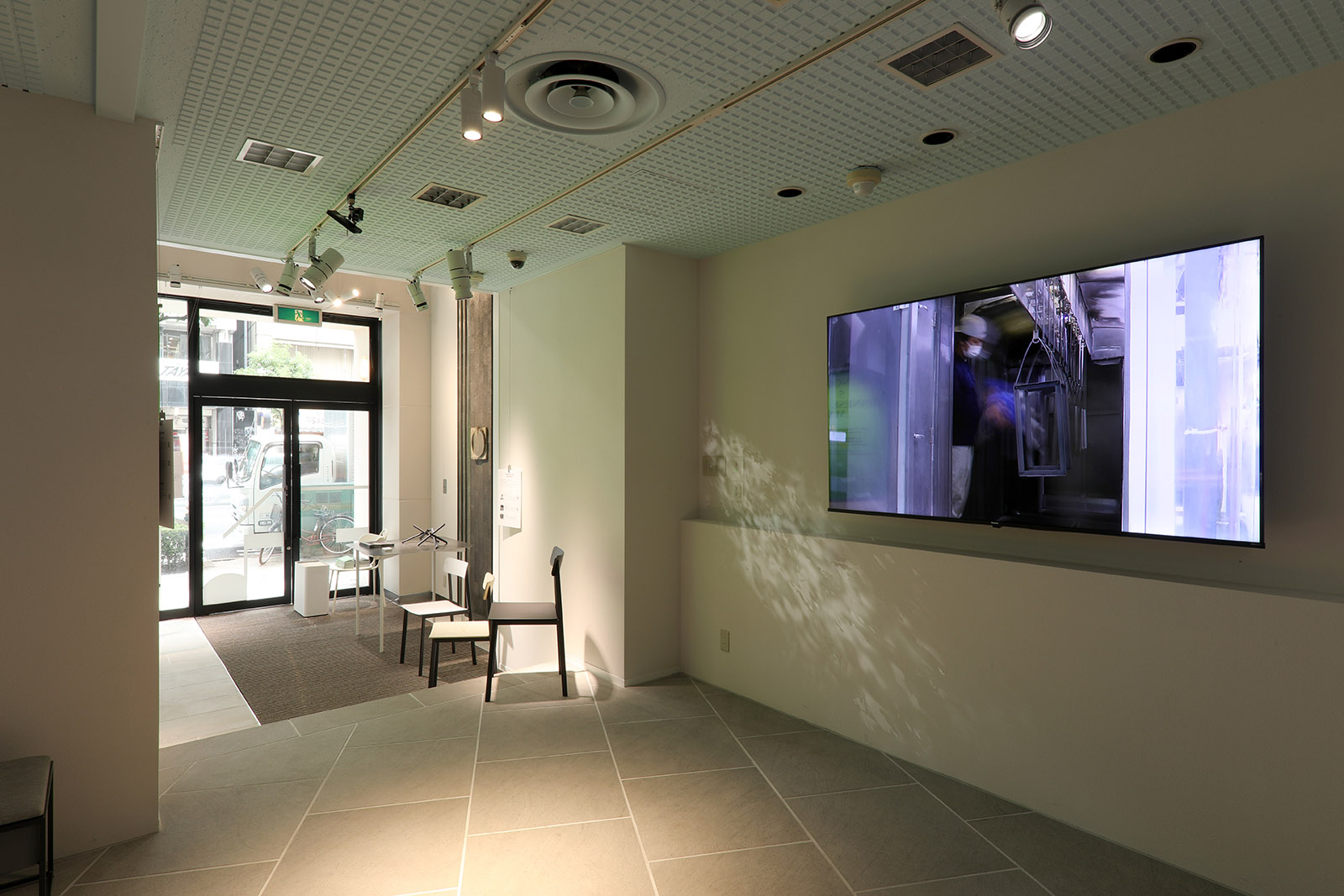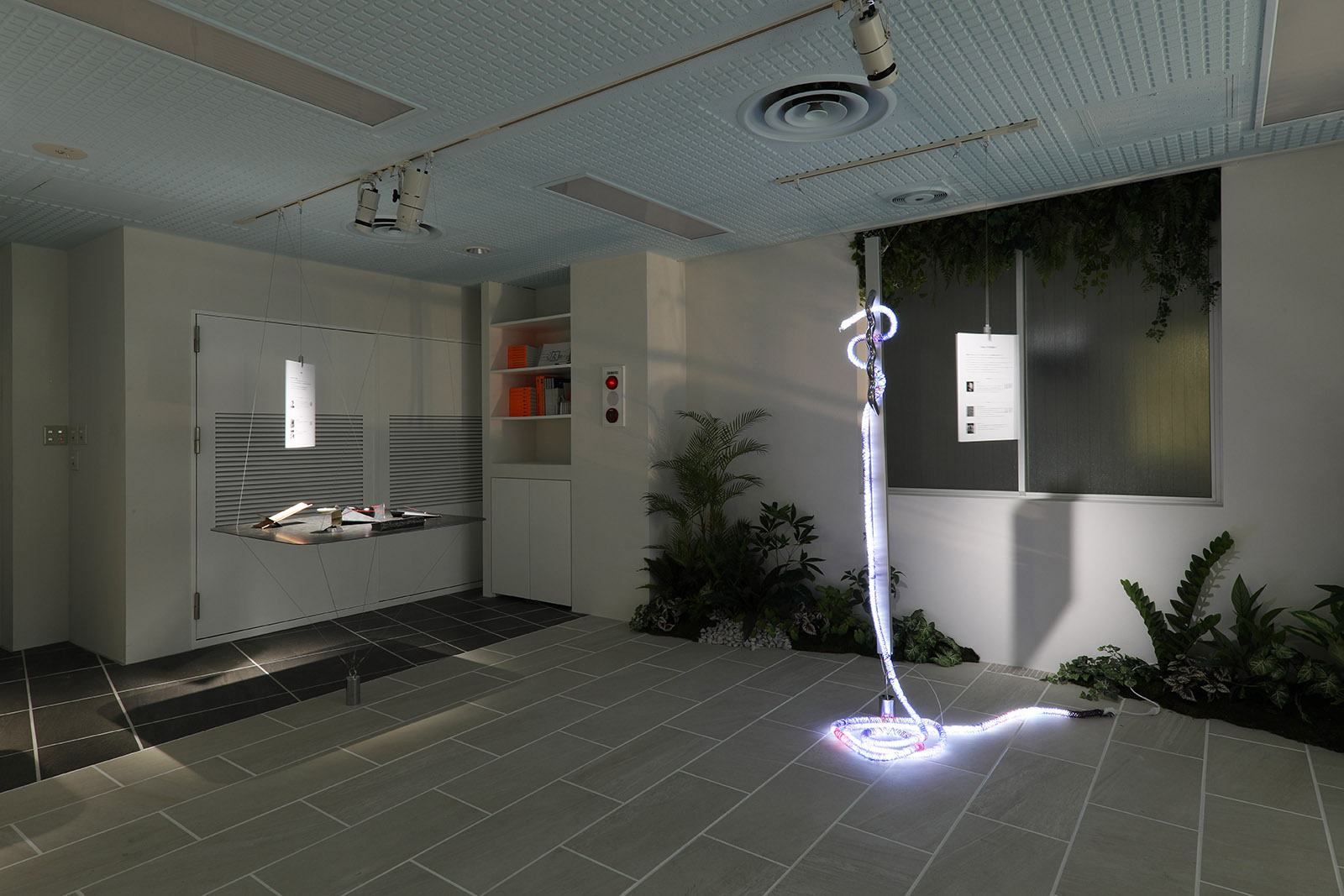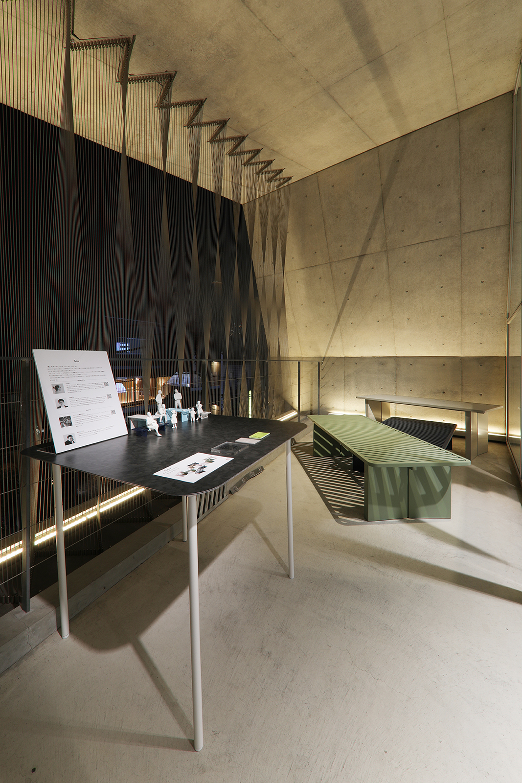 展示作品に自然と視線が集まるよう、展示台の存在感を極限まで抑えました。厚さ4mmのアルポリックを用いた天板に、荒川技研工業のワイヤーシステムを組み合わせることで、展示台自体が宙に浮かんでいるような軽やかな印象を実現。照明にはTIL社製の高品質な日本製照明を使用し、作品の魅力を繊細に引き立てました。機能と美しさを両立した、静謐で集中力の高まる展示空間です。